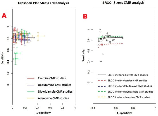Figure 12 displays (A) the crosshair plot summarizing sensitivity and specificity data for each stress CMR method—exercise, dobutamine, dipyridamole, and adenosine—and (B) the SROC curve reflecting the overall diagnostic performance of stress CMR and its primary clinical applications.