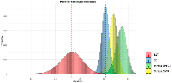 Figure 14 and Figure 15 show that SE and stress CMR exhibit high sensitivity and specificity in identifying CAD, with minimal variability as indicated by their narrow histogram distributions. In contrast, EST showed the lowest sensitivity and specificity accompanied by greater data dispersion, as reflected in its broader histograms. Unlike the other methods, stress myocardial SPECT displayed high sensitivity but comparatively lower specificity for detecting CAD. Overall, both stress CMR and SE outperformed SPECT and EST in terms of diagnostic accuracy.
