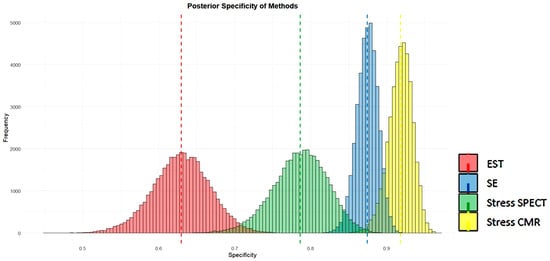 Posterior estimates of specificity of the four methods analyzed (EST, SE, stress SPECT, and stress CMR) for detecting obstructive CAD. CAD, coronary artery disease; CMR, cardiac magnetic resonance; EST, exercise stress testing; SE, stress echocardiography; and SPECT, single-photon emission computed tomography.