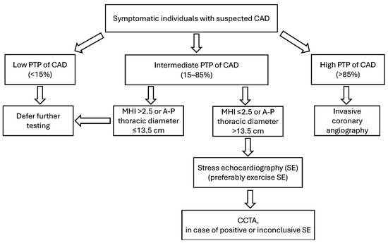 According to the 2024 European Guidelines [6], diagnostic testing is advised for symptomatic patients with a moderate (15–50%) or high (50–85%) likelihood of obstructive CAD, while those with a low likelihood (5–15%) may not require immediate testing unless symptoms persist or are unclear. The guidelines particularly endorse coronary computed tomography angiography (CCTA) for symptomatic individuals within the low to moderate (5–50%) pre-test likelihood range. For individuals assessed to have a very low likelihood (≤5%) of obstructive CAD, screening may be postponed unless symptoms continue and non-cardiac origins have been excluded.