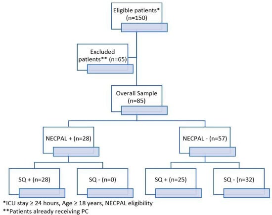 The characteristics at the baseline of the study population are reported in Table 1. A total of 85 critically ill adult patients were included in the study (Figure 1). No patients were excluded due to incomplete NECPAL data.