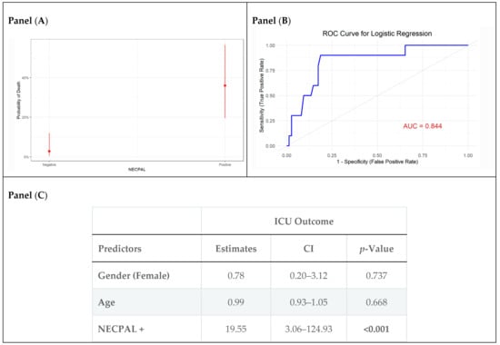 Multivariable logistic regression analysis demonstrated that NECPAL positivity was an independent predictor of ICU mortality, with an odds ratio (OR) of 19.55 (95% CI: 3.06–124.93, p < 0.001) (Figure 2C). The probability of ICU mortality is higher for NECPAL-positive patients (Figure 2A). Age and sex were not significant predictors of ICU mortality. The model demonstrated strong discriminative performance (AUC = 0.84), as indicated by the ROC curve in (Figure 2B).