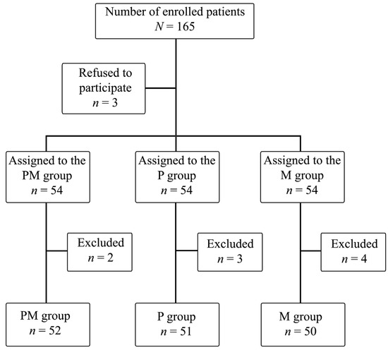 Patients were randomly assigned to three groups. In the P group, AoA-guided GA combined with single-dose IPA of 1 g of paracetamol in 100 mL saline (Paracetamol Kabi 10 mg/mL; Fresenius Kabi, Błonie, Poland) was administered 30 min before arrival in the operating room. In the M group, AoA-guided GA combined with a single-dose IPA of 2.5 g of metamizole in 100 mL saline (Pyralgin 0.5 g/mL; Polpharma S.A., Gdansk, Poland) was administered 30 min before arrival in the operating room. In the PM group, patients received AoA-guided GA combined with both IPA interventions as described for the P and M groups, in accordance with recent postoperative pain management guidelines [35].