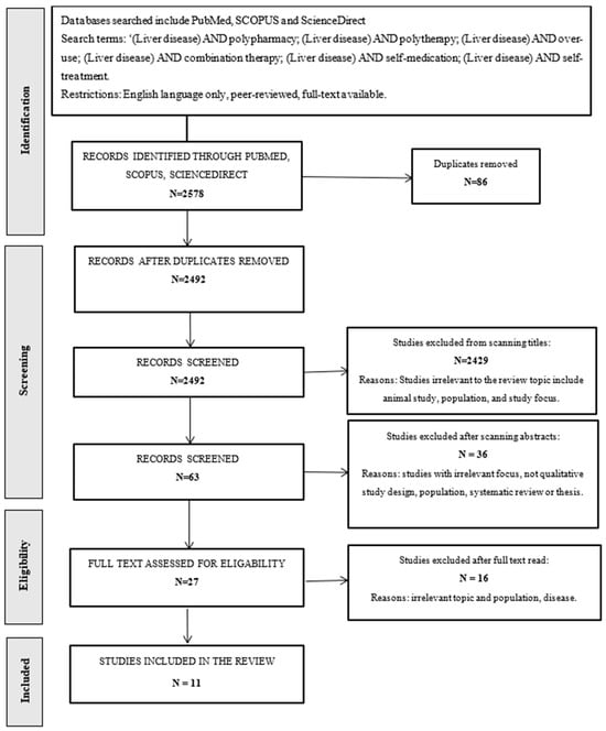 The search strategy was run on three data-bases (PubMed: 1990 to 2024, SCPOUS: 1977 to 2024 and Science Direct: 1999 to 2024) and according to the following search criteria: (Liver disease) AND polypharmacy; (Liver disease) AND polytherapy; (Liver disease) AND overuse; (Liver disease) AND combination therapy; (Liver disease) AND self-medication; (Liver disease) AND self-treatment. Database initial searches were performed between 20–25 August 2022 and updated on 10 October 2024. The inclusion criteria were limited to primary research studies, including adult patients with an existing diagnosis of a chronic liver disease and the use of polypharmacy. Specifically the focus was on randomized controlled trials (RCTs), database reviews and medical records reviews. The systematic reviews were excluded in order to avoid duplication bias, as they synthesize primary studies and may lead to overrepresentation of the findings. Additionally, studies involving animals, populations not relevant to the target group and case reports were excluded from the review due to limited generalizability and methodological constraints. This strategy presented in Figure 1.