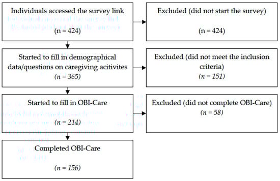 A total of 424 individuals accessed the survey link. Of these, 365 started to fill in the survey. Due to not fulfilling the inclusion criteria, 151 respondents quit before starting to fill in the German version of OBI-Care. Of the remaining 214 participants, 156 completed the OBI-Care section in the survey, resulting in a drop-out rate of 27.1%. Consequently, the responses of these 156 participants were included in the final analysis. A participant flow diagram is shown in Figure 1. The majority of the participants were female (n = 131, 84%), and the age of the participants ranged from 20 to 84 years, with a median age of 58 years (IQR 49–66). The sample only included informal caregivers living in Austria. All participants were 18 years or older and had provided unpaid care for a person who had experienced a stroke for at least three months.