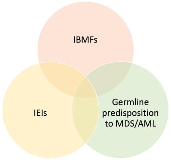 Figure 1. Overlaps between inherited bone marrow failure syndromes, inborn errors of immunity, and diseases with germline predisposition to myelodysplastic syndromes and acute myeloid leukemia. Abbreviations: IEIs = inborn errors of immunity; IBMFs = inherited bone marrow failure syndromes; MDS = myelodysplastic syndromes; AML = acute myeloid leukemia.