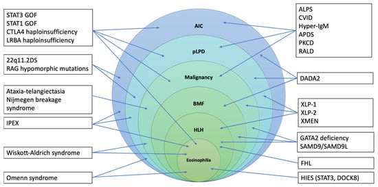 Among IEIs potentially presenting with lymphoproliferation, the most relevant are those of the ALPID spectrum, common variable immunodeficiency, APDS, EBV-related disorders, and others [18].