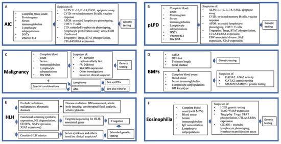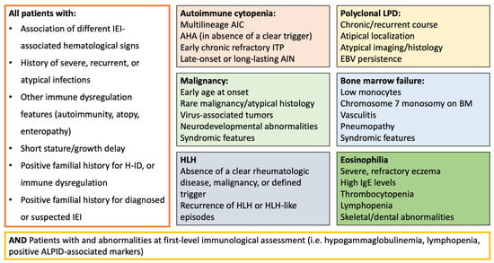 The phenotypic spectrum of inborn errors of immunity (IEIs) is in rapid expansion, and new monogenic entities are discovered every year. Non-infectious manifestations of IEI, which include autoimmunity, lymphoproliferation, atopy, malignancy, and others, are being increasingly recognized as presenting signs of a wide number of IEIs [1,2]. Therefore, an enhanced awareness about the warning signs to suspect an underlying IEI is warranted among different categories of physicians. The most common IEI-associated hematological features encompass autoimmune cytopenia (AIC), lymphoproliferative diseases (LPD), lymphoid or extra-lymphoid malignancies, hemophagocytic lymphohystiocitosis (HLH), bone marrow failure (BMF)/myelodysplastic syndromes (MDS), and peripheral or tissue eosinophilia [3]. As these clinical signs are extremely common in clinical practice, the primary challenge for physicians is the identification, among a wide number of patients, of those carrying a higher likelihood of an IEI and deserving dedicated investigations. Nowadays, the importance of reaching a molecular diagnosis in patients with IEIs that can present with hematologic immune dysregulation (H-ID) becomes more evident thanks to the availability of targeted therapies that open a new therapeutic scenario [4,5,6].
