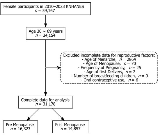 Data from the 2010–2023 KNHANES cycles were combined based on the official analytic guidelines. Combined survey weights were calculated and applied to all analyses. These weights accounted for the complex sampling design and year-to-year integration. Among women who participated in the KNHANES from 2010 to 2023, those aged 30 to 69 years were initially selected for this study. Participants were excluded if they had incomplete or implausible data for key reproductive variables, such as age at menarche, menopause, number of pregnancies, age at first delivery, breastfeeding duration, or history of OC use. After these exclusions, 31,178 women with complete data remained for the final analysis. These participants were further classified into pre-menopausal (n = 16,323) and post-menopausal (n = 14,857) groups based on their menopausal status (Figure 1). Menopausal status was determined using the survey question “Are you currently having menstruation?” with the response options “natural menopause” or “artificial menopause”. Women who selected either option and additionally reported their age at menopause were classified as post-menopausal. Those who reported ongoing menstruation were considered pre-menopausal. The questionnaire did not collect further details regarding the reasons for artificial menopause (e.g., bilateral oophorectomy, hysterectomy, or other causes). Information on hormone replacement therapy use was not available in the dataset and thus could not be considered in the classification.