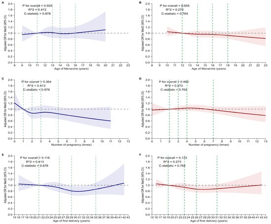 Restricted cubic spline analyses of reproductive factors and risk of metabolic syndrome stratified by menopausal status. Restricted cubic spline curves illustrate the adjusted ORs and 95% confidence intervals (shaded areas) for MetS according to age at menarche (A,B), number of pregnancies (C,D), and age at first delivery (E,F), separately for pre-menopausal (blue, left panels) and post-menopausal women (red, right panels). Models were adjusted for age, body mass index, number of pregnancies, age at first delivery, number of breastfed children, OC use, education level, income quintile, marital status, smoking status, drinking habits, walking frequency, and exercise frequency. Survey-weighted estimates were adjusted for all covariates. Knots were placed at the 5th, 35th, 65th, and 95th percentiles of each exposure distribution and are indicated by green dashed lines. Nagelkerke’s R2 and C-statistics are shown in each panel to indicate model performance. Abbreviations: MetS, metabolic syndrome; OC, oral contraceptive.