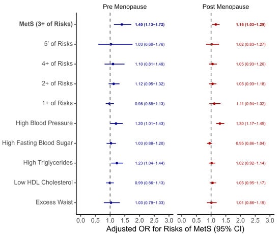Lower income was also linked to a higher MetS risk. Compared with the highest-income group, the lowest quintile had an aOR of 1.45 (95% CI: 1.14–1.84) in pre-menopausal women and 1.27 (95% CI: 1.10–1.48) in post-menopausal women. Current smoker was associated with higher MetS risk in both groups (aOR: 1.42 (95% CI: 1.03–1.96) for pre-menopausal women; 1.60 (95% CI: 1.26–2.04) for post-menopausal women), as was high drinking (aOR: 2.13 (95% CI: 1.58–2.88) and 1.41 (95% CI: 1.16–1.73), respectively).