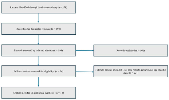 A comprehensive narrative review was conducted by systematically exploring the medical literature available up to 10 July 2025, through databases including PubMed/MEDLINE, Ovid, Scopus, Embase, Cochrane Library, Web of Science, and Google Scholar. The research focused on the pharmacological agents abrocitinib, baricitinib, and upadacitinib, utilizing both Medical Subject Headings (MeSH) and relevant medical terminology. Search queries combined terms such as “abrocitinib”, “baricitinib”, and “upadacitinib” with keywords like “atopic dermatitis”, “pruritus”, “clinical trial”, and “real-life studies”. The strategy included scanning all parts of the articles—titles, abstracts, keywords, and full texts—to ensure thorough coverage. Reference lists of pertinent articles were also reviewed to identify additional sources that might have been missed during the initial search. To reduce selection bias, two independent authors (G.L. and M.N.) performed the screening of retrieved titles and abstracts. Any discrepancies were resolved through discussion and consensus. The inclusion criteria were as follows: (1) studies evaluating JAK inhibitors in adult patients with moderate-to-severe AD; (2) studies reporting data specifically for patients aged ≥60 years or including them as a defined subgroup; (3) randomized controlled trials or real-world studies with original data. The exclusion criteria included: (1) case reports, reviews, editorials, and conference abstracts; (2) studies without accessible full text; (3) studies not reporting any age-specific data or results. Through this search strategy, a total of 278 potentially relevant articles were identified. After removal of duplicates and application of eligibility criteria, 14 studies were included in the present review. A simplified PRISMA-style flow diagram illustrating the study selection process is provided (Figure 1). In all included studies, dosing regimens were consistent with approved schedules for moderate-to-severe AD. Specifically, abrocitinib was administered at 100 mg or 200 mg once daily, upadacitinib at 15 mg or 30 mg once daily, and baricitinib at 2 mg or 4 mg once daily.
