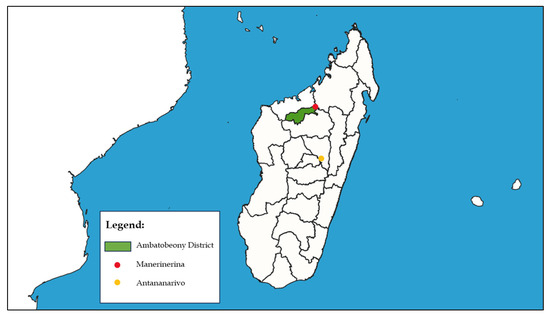 This study was conducted at Clinique Médicale BEYZYM (accredited by the Ministry of Health under ARRETE No. 27 821/2024-MSANP), a secondary-level referral hospital in the Ambatoboeny District, located in Manerinerina (16°17′ S, 47°17′ E), Boeny Region, Madagascar. The geographical location of the Ambatoboeny district is illustrated in Figure 1. The clinic consists of several departments: pediatrics, multi-profile internal medicine, infectious diseases, and surgery. It also operates specialized units, including the Nutritional Rehabilitation and Education Centre (Centre de Récupération et d’Éducation Nutritionnelle–CREN), and the Tuberculosis Diagnosis and Treatment Centre (Centre de Diagnostic et de Traitement de la Tuberculose–CDT).