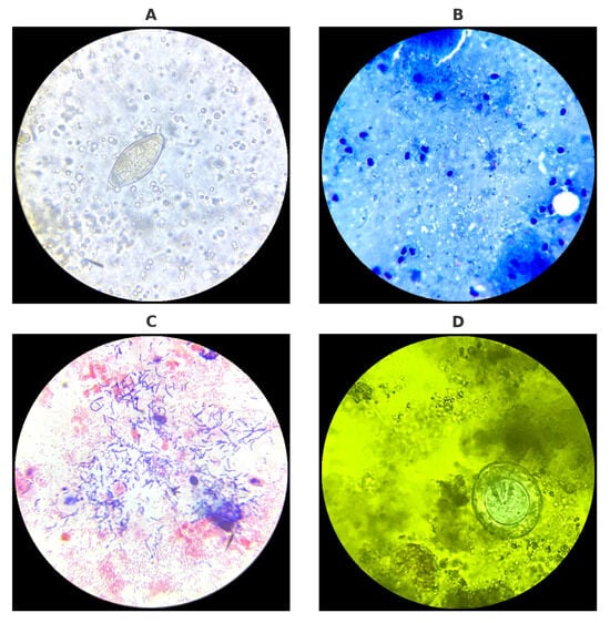 Microscopic diagnostics of urine, sputum, vaginal swab, and stool samples performed in the laboratory: (A) Egg of Schistosoma haematobium detected in urine sediment. (B) Acid-fast bacilli (Mycobacterium tuberculosis) visualized in Ziehl–Neelsen-stained sputum smear. (C) Gram-stained vaginal swab smear showing local bacterial microflora. (D) Egg of Hymenolepis nana observed in stool sample stained with Lugol’s iodine solution. Source: Kasprowicz D.