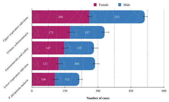 When stratified by sex, upper respiratory infections were most prevalent among males (14.95%), whereas female pelvic inflammatory disease predominated in females (16.67%) (Figure 4). Pregnancy-related conditions were exclusively observed in the female population and were therefore excluded from overall prevalence analyses.