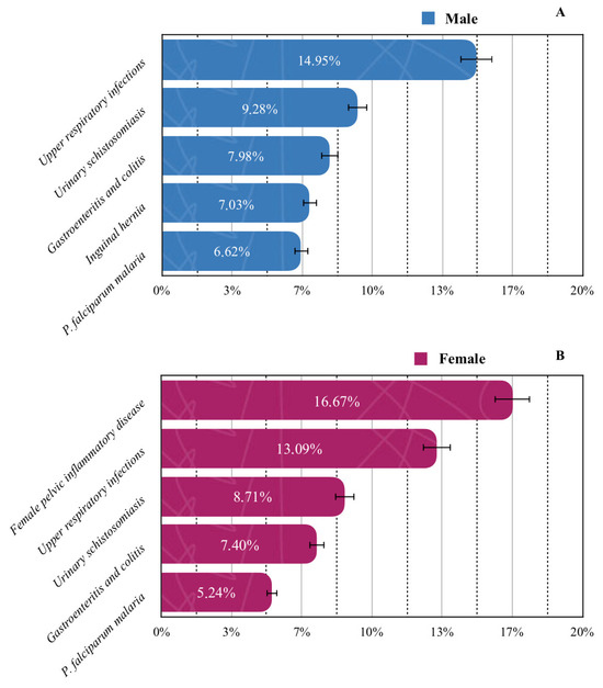 Prevalence of the five most common diseases by gender: (A) male; (B) female. Solid lines standard errors, and dashed vertical lines are auxiliary lines to help visualize the number of cases.