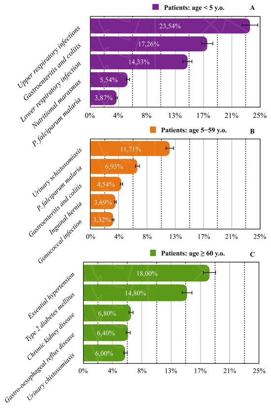 In children under five years of age, upper respiratory infections were the leading cause of admission (23.54%). Among patients aged 5–59 years, schistosomiasis caused by S. haematobium was most common (11.71%), while in the ≥60-year group, essential (primary) hypertension accounted for the highest proportion of cases (18.0%). All most common diseases across age groups are presented in Figure 5.