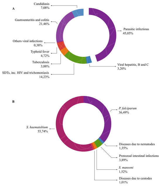 Proportional distribution of infectious and parasitic diseases (A) and detailed classification of parasitic diseases (B).