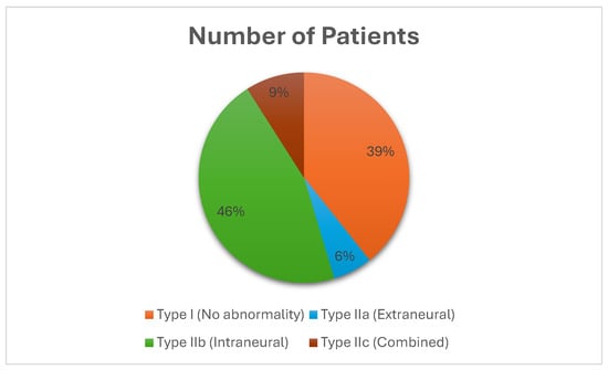 Road traffic accidents (RTAs) were the predominant trauma mechanism, accounting for 40.3% of cases, followed by sports-related injuries (22%), falls (18.8%), and other causes (13.8%). MRI findings were reported for 399 patients. Intraneural abnormalities (Type IIb) represented the most common MRI lesion (46%), followed by “real SCIWORA” cases with no abnormalities (Type I, 39%). Combined lesions (Type IIc, 9%) and extraneural abnormalities (Type IIa, 6%) were less frequent, as shown in Figure 2.