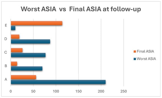 This horizontal bar chart illustrates the distribution of ASIA grades at the time of worst neurological impairment during the hospitalization (blue bars) and at final follow-up (red bars) in 454 pediatric SCIWORA patients. At presentation, nearly half of the patients (46.25%) were classified as ASIA A, indicating complete spinal cord injury. However, at follow-up, the number of patients remaining in ASIA A decreased substantially to 24.45%, suggesting partial or complete neurological recovery in a significant portion. Conversely, the number of patients with normal neurological function (ASIA E) increased from only 4.54% at baseline to nearly 50% at follow-up. The remaining ASIA grades (B, C, and D) followed a similar trend, with decreases in severe grades and increases in less severe or normal findings.