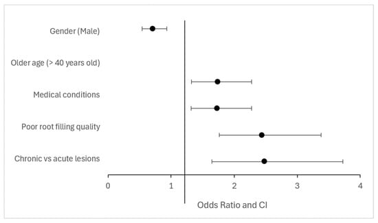 These results emphasize the multifactorial nature of periapical pathology and underscore the importance of combining anatomical localization with technical quality indicators in the clinical assessment of endodontic outcomes.