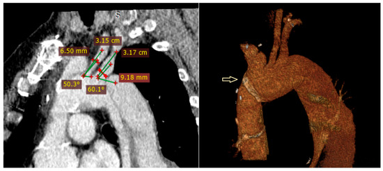 Preoperative CTA coronal section measurements of the diameter of the left carotid and subclavian arteries and the angle formed with the arch, three-dimensional images of the aortic arch, and the suture line from the previous operation (arrow).