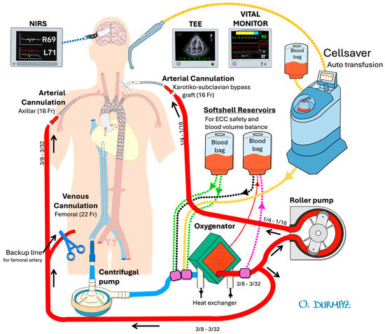 Details of selective cerebral bypass circuit configuration [5]. The circuit ensures continuous perfusion to the brain by directing blood flow through the left carotid–subclavian bypass and the right axillary artery. Cannulas are strategically placed to maintain adequate cerebral oxygenation and minimize ischemic risks throughout the operation. The flow rate and circuit pressure are carefully monitored to optimize perfusion efficiency.
