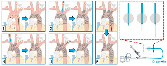 Operative details of the in situ fenestration [5]. The tool kit used for in situ needle fenestration, including the balloon at its tip and the needle system, has been illustrated visually (last image). The wire is placed into the ascending aorta, and the stent graft is deployed in the aortic arch (1). Under selective cerebral perfusion, the left common carotid artery is first fenestrated, and a stent is deployed (2). Subsequently, the right brachiocephalic artery is fenestrated, and a stent is placed (3). The fenestration of the left subclavian artery is performed, completing the fenestration of the aortic arch (4). An additional stent graft is then deployed in the descending aorta (5).