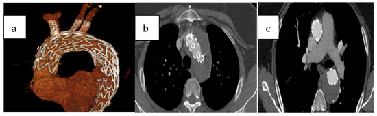 A contrast-enhanced computed tomography (CT) image obtained 6 months after the procedure with volume-rendered 3D reconstruction (a) The original axial image clearly demonstrates the contrast enhancement of the stents in the triple arch branches (b) and the thrombosed false lumen in the descending aorta (c).