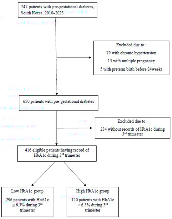 We divided the participants into two groups according to the HbA1c levels (47.5 mmol/mol, 6.5%) in the 3rd trimester. The HbA1c cut-off of 47.5 mmol/mol (6.5%) was selected based on the diagnostic threshold for diabetes mellitus recommended by the American Diabetes Association and the International Association of Diabetes and Pregnancy Study Groups for early pregnancy, linking this threshold with increased risk of adverse perinatal outcomes [,]. Women with HbA1c < 47.5 mmol/mol (6.5%) were categorized as the “Low HbA1c group” and women with HbA1c levels > 47.5 mmol/mol (6.5%) were categorized into the “High HbA1c group” (Figure 1).