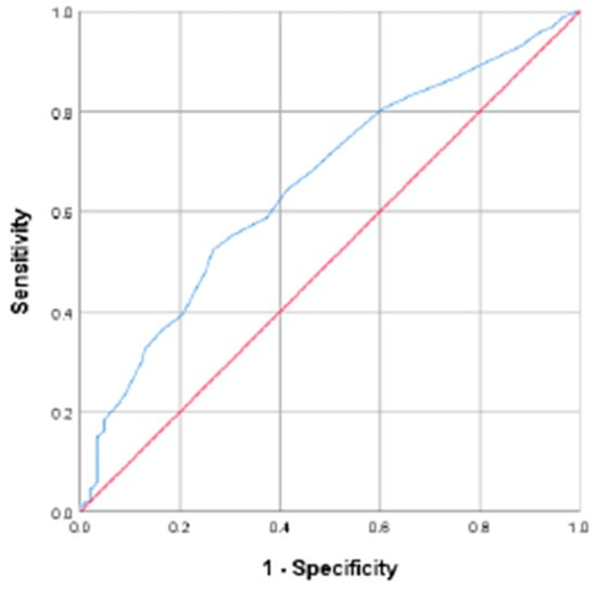 ROC curve (Blue curve) for HbA1c during third trimester and neonatal composite outcomes (AUC, 0.655; cut-off value, 43.7 mmol/mol; sensitivity, 52.3%; specificity, 73.5%) (Red curve, no discrimination corresponding random classification, which means AUC = 0.5).