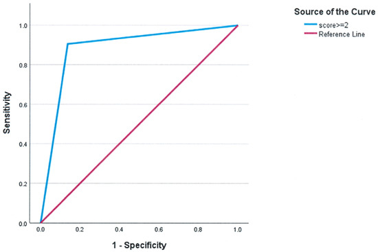 ROC curve of the composite score to identify intolerance to inhaled treprostinil. For clinical use, choosing a cutoff of ≥2 results in AUC = 0.884 ± 0.048, p < 0.001.