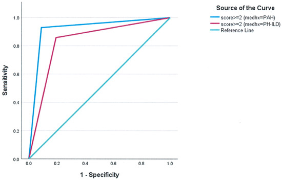 The predictive performance of the score was assessed in both PAH and PH-ILD patient groups with internal validation conducted to ensure the robustness of the findings. A categorical threshold of ≥2 demonstrated strong predictive performance. In PAH, the AUC was 0.921 (SD = 0.053, p < 0.001), while in PH-ILD, it was 0.833 (SD = 0.093, p < 0.001) (Figure 2).