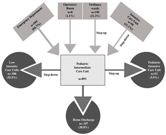 PIMCU receives acute patients from the ED, patients from general pediatric wards or other regional pediatric hospitals requiring care intensification, post-surgical patients from the operating rooms, and children from the PICU as the initial step-down phase of care. When clinical stability is achieved, children are transferred to general wards or may be directly discharged home in case of rapid clinical improvement. Conversely, children who develop clinical deterioration are admitted to the PICU. The admission and discharge criteria for both PIMCU and PICU were developed with input from multiple stakeholders and reflect the availability of resources, clinical experience, and guidance from the American Academy of Pediatrics document on the structuring of PIMCUs [3]. (Supplementary Materials Document S1 [21,22,23]). The category “Surgical/orthopaedical” included both patients who underwent surgery and those with a surgical or orthopedic condition who did not require an operation.
