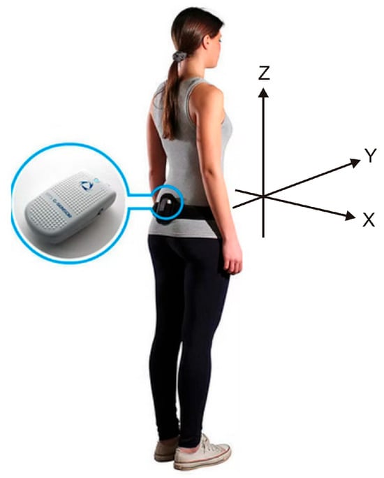 Graphical representation of the BTS G-Sensor (modified from https://www.nept.us/bts-g-walk-p-walk, accessed on 19 June 2025). The X-axis indicates mediolateral (ML) tilt of the trunk, with positive values representing rightward tilt; the Y-axis represents anterior–posterior (AP) movement, with positive values indicating forward motion; and the Z-axis denotes vertical movement, with positive values indicating upward displacement.