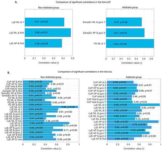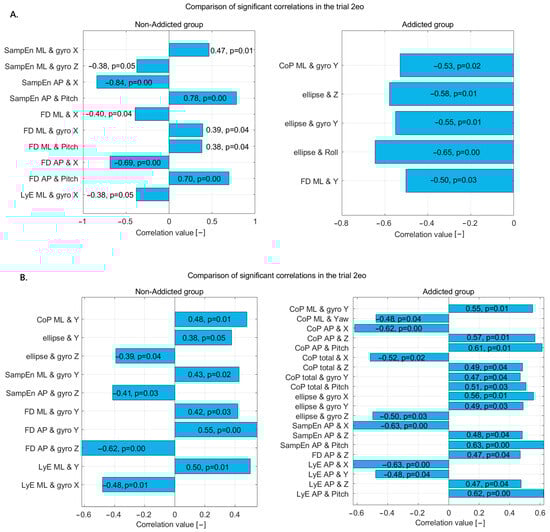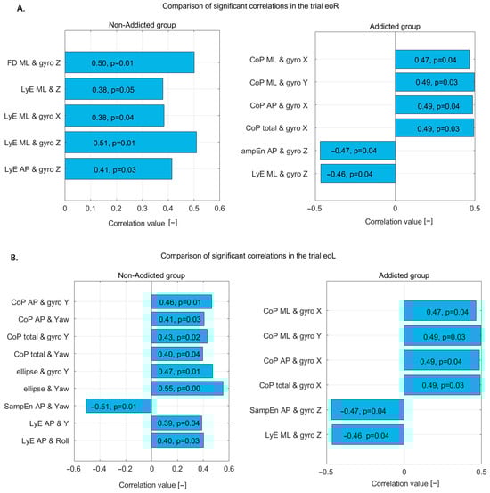Statistically significant correlations in non-addicted and addicted groups during (A) the 2eo trial and (B) the 2ec trial—correlation coefficients and p-values displayed on bars.