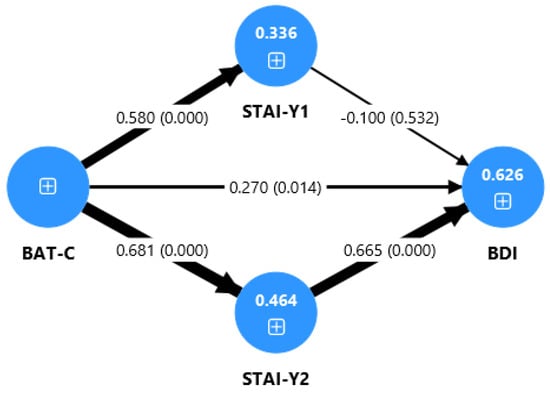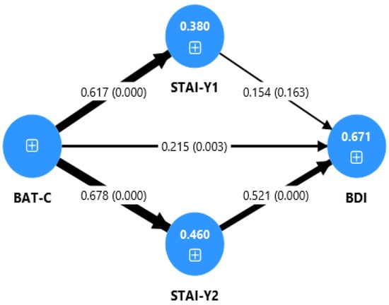Path model for the SLDs sample. BAT-C: Burnout Assessment Tool—Core Symptoms; BDI: Beck Depression Inventory; STAI-Y1: State-Trait Anxiety Inventory—Form Y1 (State); STAI-Y2: State-Trait Anxiety Inventory—Form Y2 (Trait); SLDs: Specific Learning Disabilities; TD: Typical Development. The thickness of the arrows corresponds to the strength of the relationships between the variables. Values represent path coefficients (β) and p-values (in parentheses).