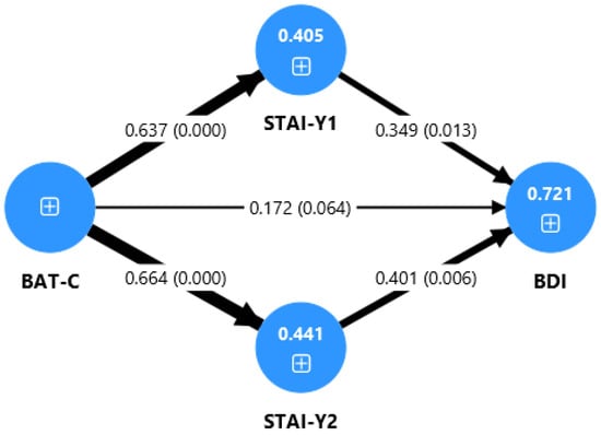 The core analysis tested a path model with BAT-C as the independent variable, BDI as the dependent variable, and STAI-Y1 and STAI-Y2 as mediators. This model was tested on the overall sample and separately for the SLD and TD groups. Given the specific characteristics of our data and model, we selected Partial Least Squares Structural Equation Modeling (PLS-SEM) [36] over traditional covariance-based SEM for three key reasons. First, the dependent variable (BDI) was not normally distributed, and PLS-SEM is a non-parametric technique that does not rely on distributional assumptions, making it robust in such scenarios [45]. Second, our sample size, particularly when divided into subgroups, was limited relative to the complexity of our model, which comprised 4 latent constructs and 53 indicators. PLS-SEM is well-suited for achieving statistical power with smaller samples and complex models [36]. Finally, PLS-SEM is ideal for models aimed at prediction and theory development, which aligns with the exploratory nature of our path analysis.