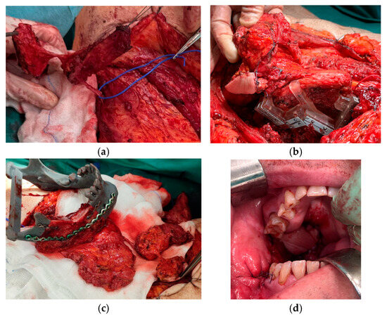 When discussing the issue of complex oromandibular reconstruction, chimeric flaps based on the fibula and the anterolateral thigh region should be mentioned [21,22]. There are many modifications of the chimeric fibular flap, which may consist of bone, muscle, and multiple skin paddles. Its use seems particularly beneficial in through-and-through orofacial defects that require both outer coverage and inner lining [21]. The anterolateral thigh osteomyocutaneous free flap (ALTO) can also be used in the reconstruction of large bony and soft tissue defects. A disadvantage of this technique is the increased risk of femoral fractures [22].