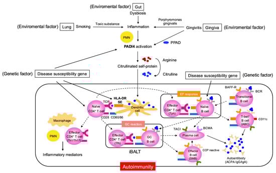 Pathologic mechanisms linking environmental and genetic factors to autoimmunity in the preclinical phase of RA. This figure details the interplay between genetic susceptibility (e.g., disease risk genes including PADI4) and environmental insults such as smoking, gingivitis caused by Porphyromonas gingivalis, and gut dysbiosis. It describes how these factors drive post-translational modification of self-proteins, notably citrullination catalyzed by PPAD and PADI4, creating neoantigens that breach immune tolerance. The process involves tissue sites such as the lung, gingiva, and gut, and depicts the initial activation of innate immune cells (e.g., neutrophils and dendritic cells), subsequent T and B cell activation through antigen presentation (via HLA-DR molecules and costimulatory signals such as CD28/CD80/86), and the fostering of local and systemic autoimmune responses and inflammation. ABC, age-associated B cell; ACPA, anti-citrullinated protein antibody; BAFF-R, B-cell-activating factor-receptor; BCMA, B-cell maturation antigen; EF, extrafollicular; GC, germinal center; iBALT, inducible bronchus-associated lymphoid tissue; PADI, peptidyl arginine deaminase; PPAD, porphyromonas gingivalis peptidylarginine deiminase; PMN polymorphonuclear neutrophil; TACI, transmembrane activator and CAML interactor; Tfh, T follicular helper; Tph, T peripheral helper.