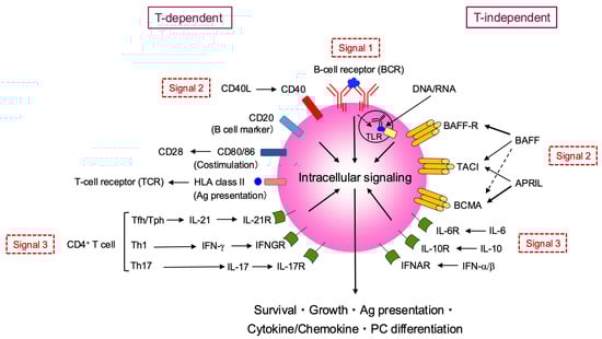 B cell activation, differentiation, and effector functions in autoimmune responses. This figure provides an overview of B cell activation via T-dependent and T-independent pathways. T-dependent activation requires three signals: antigen binding to the B-cell receptor (BCR) (Signal 1), co-stimulation via CD40-CD40L and CD28-CD80/86 interactions with CD4+ T cells (Signal 2), and cytokine signaling (Signal 3) from Tfh/Tph, Th1, or Th17 cells. T-independent activation also involves antigen/TLR binding (Signal 1) and additional signals (Signal 2) from BAFF/APRIL binding to BAFF-R, TACI, and BCMA, along with cytokine signaling (Signal 3) from IL-6, IL-10, and IFN-α/β. All these pathways converge on intracellular signaling to promote B cell survival, growth, and antigen presentation, cytokine/chemokine production, and plasma cell differentiation. BAFF, B-cell-activating factor; BCMA, B-cell maturation antigen; IFN, interferon; TACI, transmembrane activator and CAML interactor; PC, plasma cell.