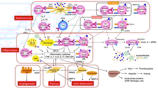 To date, no studies have shown that the inhibition of specific cytokines during the preclinical phase can prevent the onset of RA. For instance, the administration of TNF-α inhibitors during the preclinical stage does not suppress disease development, likely because TNF-α plays a more prominent role during the arthritis (clinical) phase, as discussed later. In contrast, IL-6, which promotes the differentiation of Tfh and Tph cells as described above, may hold promise as a preventive target. Results from some studies suggest that IL-6 inhibitors and JAK inhibitors may have the potential to suppress disease progression in high-risk individuals—such as those who are autoantibody-positive or exhibit subclinical inflammation [41]. Notably, JAK inhibitors are of particular interest as a potential therapeutic strategy in the preclinical phase due to their capacity to regulate the activity of type I IFN, as described above. However, there is currently no evidence supporting its use for disease prevention, and further research is needed [42].