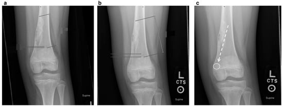 Serial radiographs demonstrating the characteristic migration pattern of NOF away from the growth plate in a 9-year-old girl over 6 months (a,b). Note the eccentric location, sclerotic rim, and “bubbly” appearance that distinguish it from other lytic lesions. Image (c) demonstrates the major axis of the non-ossifying fibroma with an imaginary line (dashed arrow) pointing toward the gastrocnemius insertion (white circle), which is a typical migration pattern for NOFs.