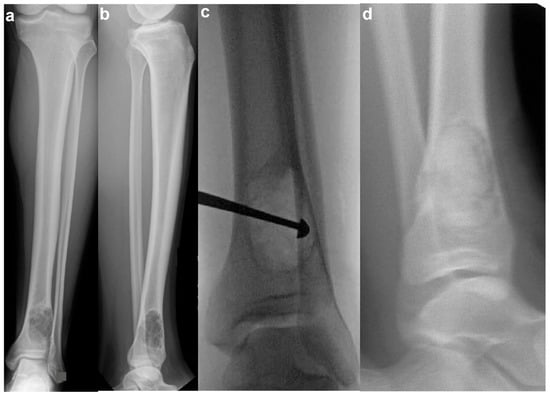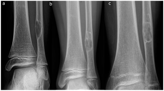 - Collier, C.D.; Nelson, G.B.; Conry, K.T.; Kosmas, C.; Getty, P.J.; Liu, R.W. The Natural History of Benign Bone Tumors of the Extremities in Asymptomatic Children: A Longitudinal Radiographic Study. J. Bone Jt. Surg. 2021, 103, 575. [Google Scholar] [CrossRef] [PubMed]