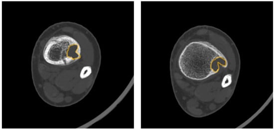 Figure 3. Axial computed tomography slices demonstrating the “Pac-Man Sign” in a 13-year-old boy with a pathologic fracture through a distal tibia NOF. The characteristic shape is highlighted in yellow. The “Pac-Man Sign” is a highly specific (95%) predictor of pathologic fracture, and when present with other high-risk features, prophylactic surgical intervention should be considered. - Syndesmosis Sign—Advanced imaging shows the syndesmosis inserting into the distal tibia lesion. This sign was found to be highly sensitive (94%) but less specific (48%) for predicting fracture risk.