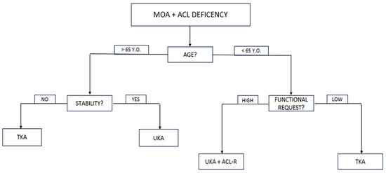 19]); no OA in the lateral or patellofemoral compartments (KL grade 0 or 1); no lesions of the collateral ligaments; clinical and radiographic evidence of ACL deficiency; age under 65. An algorithm for determining if a patient is a suitable candidate for simultaneous UKA and ACLR is presented in