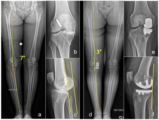 27], true lateral view, and 30° patellar axial view radiographs were obtained preoperatively and at every follow-up visit. The hip–knee–ankle (HKA) angle was measured both pre- and postoperatively, defined by an angle formed by a line connecting the center of the femoral head to the center of the knee, and a second line from the center of the knee to the center of the talus. Varus alignment was defined as a mechanical axis less than 180°. Radiographs were assessed by two trained observers blinded to postoperative outcomes using a Picture Archiving and Communication System (Philips Medical Systems; Sectra-Imtec AB, Linköping, Sweden). All clinical and radiological assessments were independently conducted by two examiners (S.P. and F.B.) who were not involved in the surgical procedures.