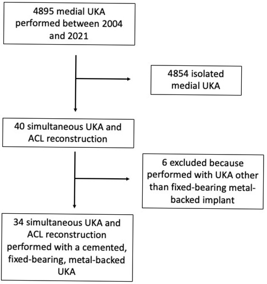 During the study period, 13,225 knee replacements were performed in our Department, of which 5131 (38.8%) were UKAs; 4895 (95.4% of all UKAs) were medial UKAs. Simultaneous medial UKA and ACL reconstruction with a cemented, fixed-bearing, metal-backed UKA was performed in 34 patients (0.7% of all medial UKAs). All patients reached the minimum 2-year clinical follow-up, and their medical records were complete.