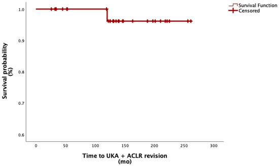 Of the thirty-four patients included, only one (2.9%)—who belonged to the UKA + primary ACLR subgroup—ultimately underwent revision surgery 10 years after the index procedure and was converted to TKA. This corresponds to a survival rate of 97.1% at a mean follow-up of 11 years.