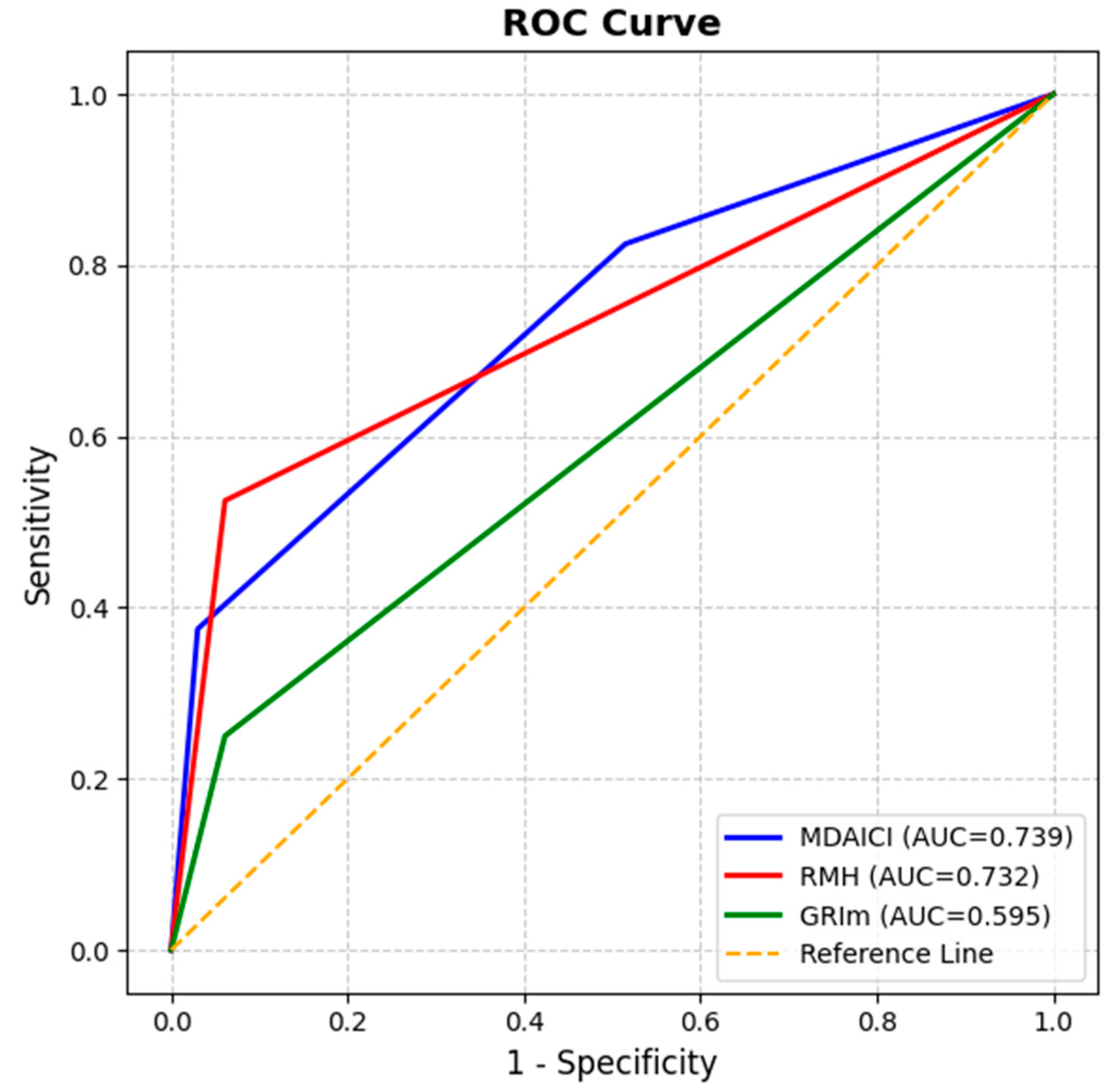 MDA-ICI (int. vs. low) (high vs. low) | 1.62 (0.60–4.40) 4.24 (1.33–13.55) | 0.339 0.015 | 0.730 | 0.739 (0.626–0.852) | <0.001 |